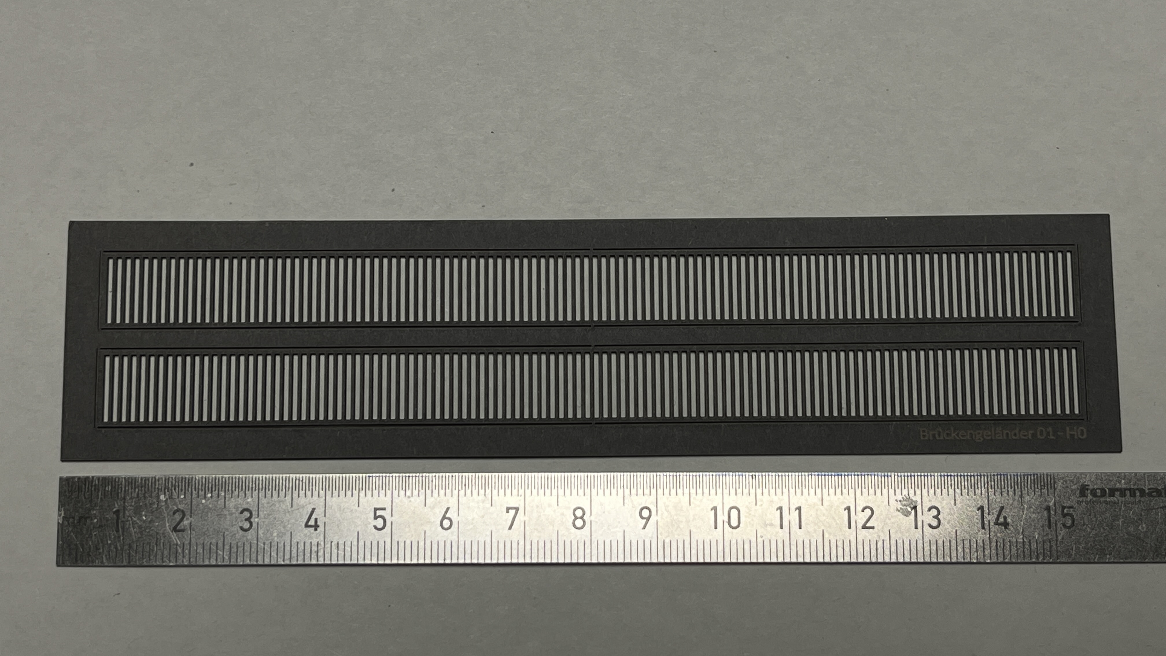 Typisches Brückengeländer, wie es auf vielen Autobrücken wieder zu finden ist. Das Modell ist im Lasercutverfahren gestellt. Material ist hochwertiger Lasercutkarton.